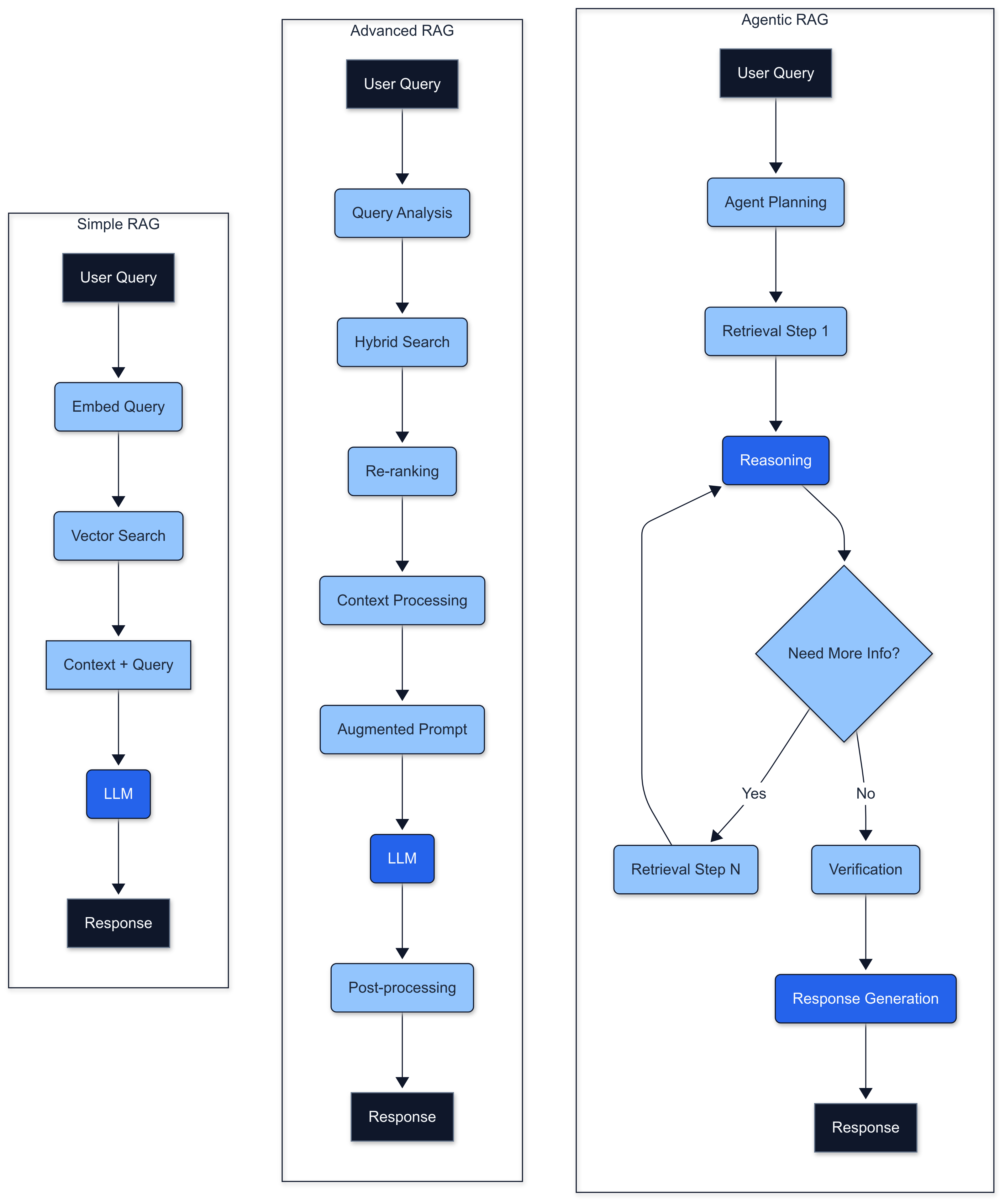 2Advanced RAG: For demanding applications requiring higher precision, recall, or handling complex queries.